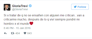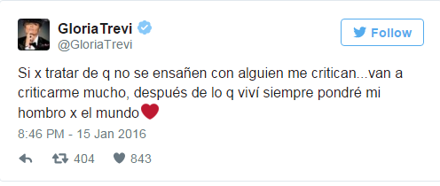Más tarde la modelo lanzó otro tuit en el que dijo: «A los fans de Gloria me disculpo si se sintieron ofendidos. Todos tenemos derecho a tener opiniones y a publicar lo que nos da la gana».