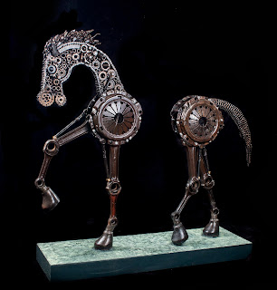 “Reinvención de los Metales”, es su primera exposición de esculturas hechas en metales, en la que Barrera trabaja cada pieza bajo la técnica de ensamblaje de diversos metales con soldaduras, atornillados y patinados.