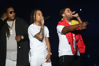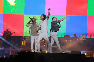 | Ozuna, Mark B y Gabriel mientras interpretan el tema «Playa y Arena». |