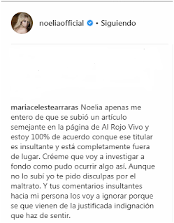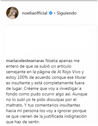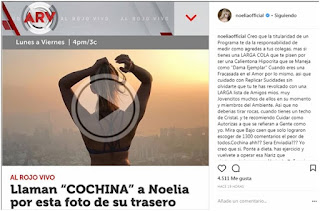 La cantante Noelia utilizó sus redes sociales para defenderse luego que el programa Al Rojo Vivo colgara una información llamándola «Cochina» por enseñar el trasero en una foto, algo que molestó a la artista boricua, donde aprovechó para llamar la atención de la periodista María Celeste Arrarás por hacerse eco solo de una parte de las opiniones del público para querer hacerle daño a ella.