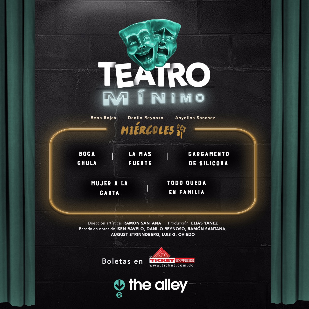 Las entradas tienen con un costo de 500RD$ y el espectador podrá ver 5 piezas de teatro: LA MÁS FUERTE, TODO QUEDA EN FAMILA, CARGAMENTO DE SILICONAS, MUJER A LA CARTA Y BOCA CHULA. El elenco lo conforman Beba Rojas, Danilo Reynoso, Anyelina Sánchez y una participación especial de Isen Ravelo.