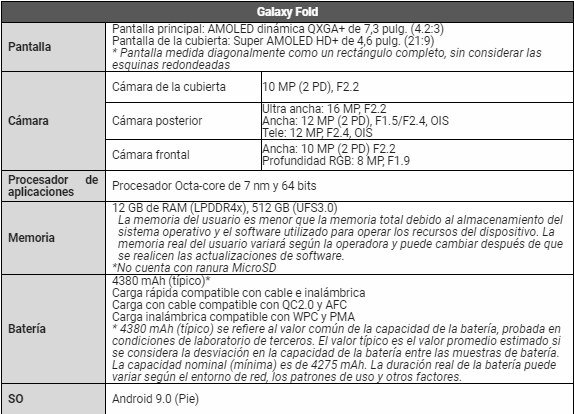 Especificaciones del producto Galaxy Fold: